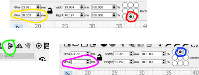 Det viktiga steget! Selecta baksida-lagren, centrera koordinatsystemet neråt (rött), skriv ner YPos (gul, vi kallar den Y). Spegla sedan lagret vertikalt (grönt). Centrera sedan koordinatsystemet uppåt (blått). Räkna ut 44.6 + L - Y och skriv in i YPos.